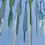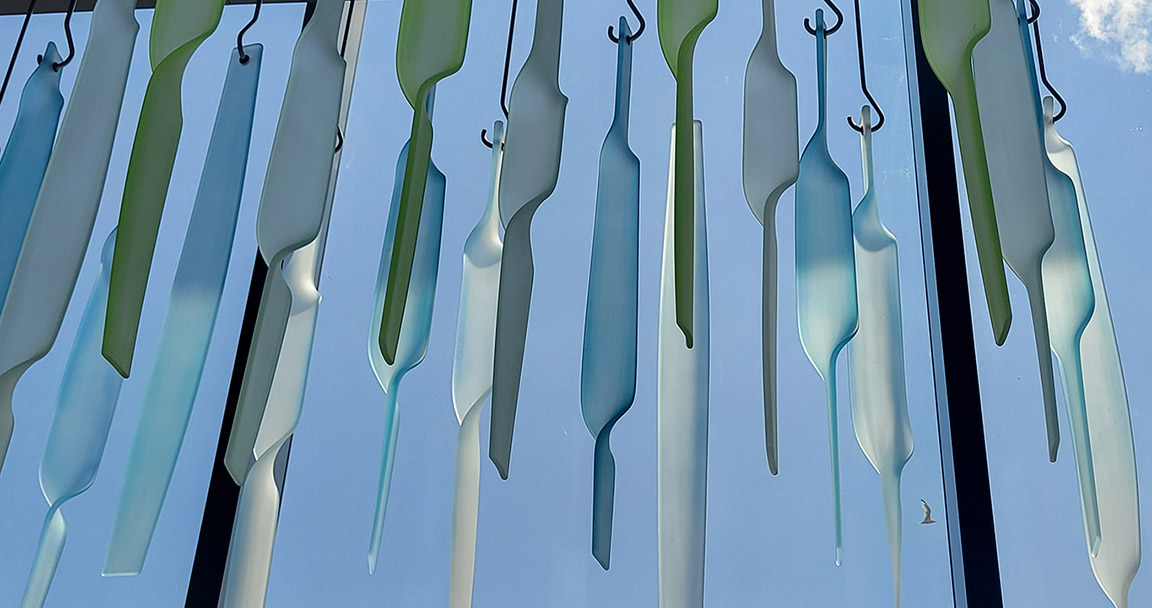 Composed of flat glass shapes twisted at the top and bottom, the work suggests hanging strings reminiscent of the strips in a wampum belt. These refer to the constant, living, and uninterrupted relationship between earth and sky and to the fragile and multiple nature of ties woven, of communication, and of community.