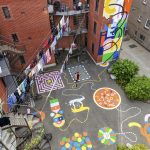 It symbolizes the conclusion of this process, highlighting the precious bonds forged between learners and their new environment. In addition to the mural, children’s games were designed by the two artists and painted on the ground by the MU team. In keeping with the mural, the artists drew on the ideas of the children living in the homes to create games that symbolize connection.