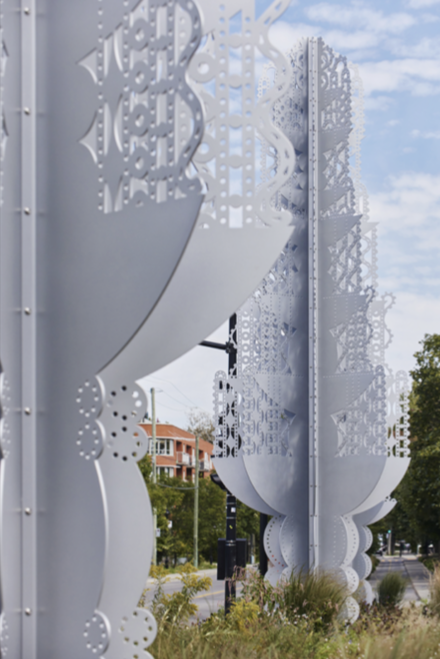 Forming a landmark in the urban landscape, Fontaines is a monumental artwork composed of three openwork aluminum sculptures. Each rises on one of the three stretches of median on rue Saint-Grégoire facing avenue Christophe-Colomb. The work draws attention to the north entrance to Parc Sir-Wilfrid-Laurier, offering a point of convergence for pedestrian, bicycle, and car traffic and a space with a symbolic sense of freshness for Montréal residents.