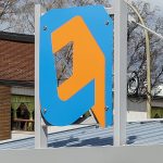 This intrinsically plural work manifests itself in some 70 variations installed on shelters of the Pie-IX Bus Rapid Transit (BRT). The colourful and minimalist aesthetic stelae recalls flags and other cultural emblems.