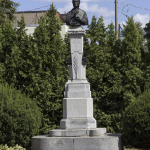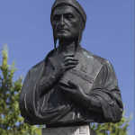 Situated in the eponymous park in the heart of Little Italy, this waist-up bust with arms sitting on a tall pedestal, portrays Dante dressed in the style of ancient Rome. He is surrounded by his literary works: he holds La Commedia to his breast, and other books are arranged in piles on small columns on the sides of the pedestal and topped with laurels. The top of the main column is decorated with various ornamentations and its core presents a laurel branch.