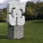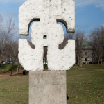 L’ange de pierre is a monolithic white-marble sculpture executed by Pierre Székely for Mount Royal Park. Its simple, unadorned form leaves visible the rectangular shape of the block of stone from which it was carved, and its main faces have two different textures. On one side, the traces of the artist’s chisel are manifested in a very rough relief. On the other side, a smoother surface highlights the block’s abstract silhouette. On both lateral surfaces of the artwork, rounded geometric forms are carved into the stone.