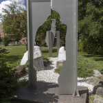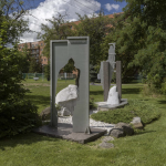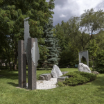 The artwork, situated in Parc Caron, “is presented as a private space, reflecting the general image of the park.” The sculptural grouping’s various elements are arranged on a platform. A vertical metal sheet, into which a silhouette has been cut, provides access to the platform, on which are placed a series of aluminum and granite slabs and rocks of various sizes. Two rocks, larger and painted white, suggest “silhouettes of people bent over.”