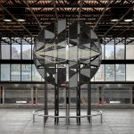 The circular shape and pattern of the sculpture cite the artwork of architect Claude Boucher visible on the station platforms.