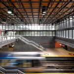 Perfectly centered and symmetrical, contrasting with the right angles and transparency of the station, Perspective divides and organizes space. Its grid-like structure offers different framed views. The artwork’s shape, pattern and materials are inspired by the formal elements of the station and allow it to blend in harmoniously.
