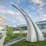 The work occupies the main entrance and roof terrace of the Montreal Heart Institute. The title Portée refers to a dance movement. It is also synonymous with amplitude, oscillation, distance in architecture, or graphic range for writing musical notes.