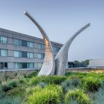 Macroscopically, on the scale of the building, the work is developed as forms in motion of extension, prolongation, stretching, and imbalance. The “microscopic” aspect is expressed, on a closer scale, by numerous textures and patterns that animate each area of the sculptures differently.