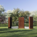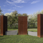 Set in the Montréal Botanical Garden’s collection of apple trees, a sculpture composed of three vertical volumes of Corten steel and two horizontal blocks of granite that are slightly concave at the top offer a window that opens to the nature surrounding it.