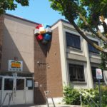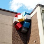 A sphere made up of nine aluminum cubes painted red, blue and yellow sits above the entrance to the daycare center at Saint-Rémi elementary school. This amalgam of cubes is reminiscent of the colorful block constructions that young children can assemble.
