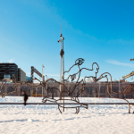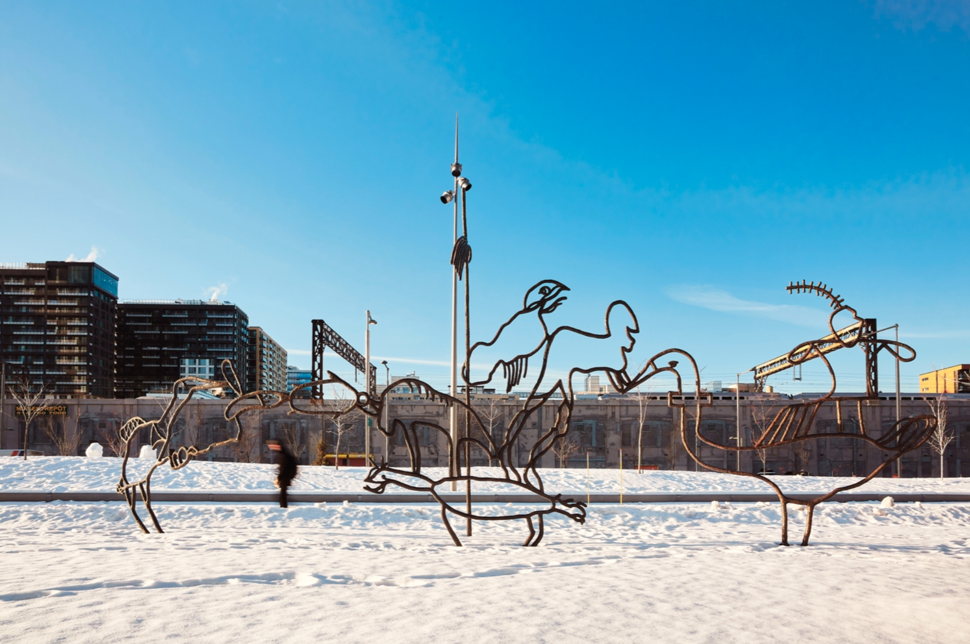 L’œuvre est composée de quatre ensembles de sculptures de bronze disposés longitudinalement sur l’îlot, qui créent ainsi un espace ouvert et aéré invitant à l’exploration et à la déambulation piétonnière. L’un des ensembles de sculptures, qui superpose les figures de manière ludique, évoque le rassemblement et l’esprit de communauté. Les effigies dans l’œuvre ont été choisies tant pour leur importance historique que pour leur richesse visuelle.
