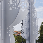 La dentelle des plaques d’aluminium ajourées transpose les gestes fins et les motifs répétitifs des œuvres sur papier de l’artiste. En laissant passer la lumière, elle illustre les variations subtiles des gouttelettes ruisselantes, le mouvement de l’eau et le rythme constant de ses jets, le tout suggérant l’effet relaxant de la fontaine.