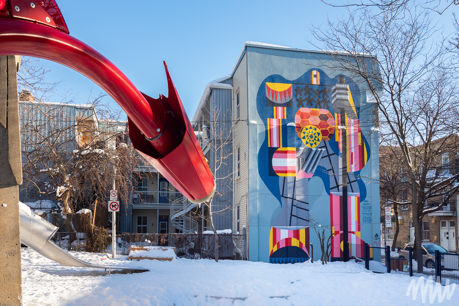 Ce projet est la touche finale à la revitalisation du parc des Joyeux-Vikings qui a eu lieu durant l’été 2019. La murale, réalisée par l’artiste Borrris, rend hommage à la mobilisation citoyenne qui, entre 1978 et 1980, a permis l’aménagement de ce parc dans un terrain laissé vacant suite aux incendies du « week-end rouge » de 1974 qui détruisirent 185 logements.