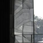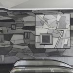 Sur le grand mur du côté est, un tableau carré montre la topographie du mont Royal. Gravée dans le béton, cette vue aérienne s’articule dans une structure visuelle abstraite et dynamique qui rappelle les strates géologiques.